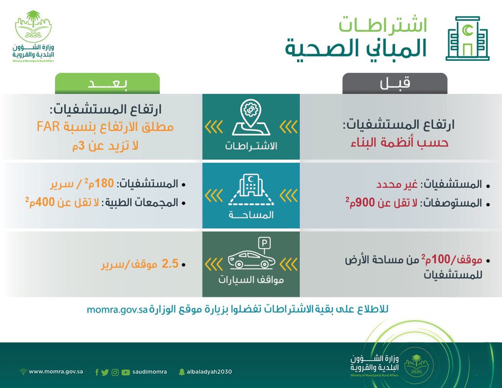 وزارة الشؤون البلدية والقروية والإسكان on twitter حد د تسهيل الاشتراطات البلدية للمباني الصحية مساحة 180 متر مربع لكل سرير في المستشفيات وأل ا تقل عن 400 متر مربع للمجمعات الطبية وموقفين ونصف للمريض الواحد وزارة الشؤون البلدية والقروية