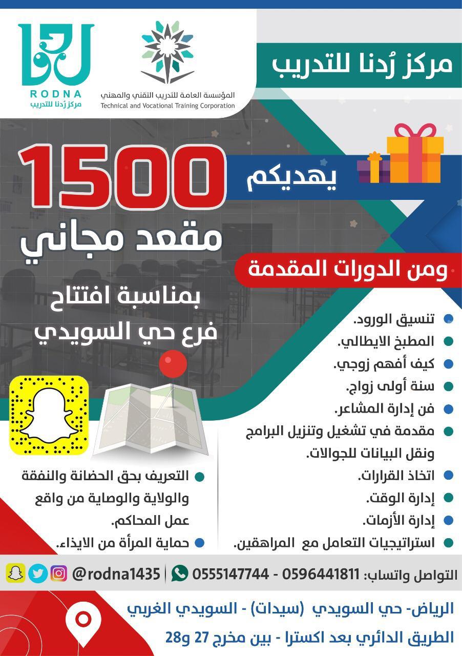 مركز ومعهد ر دنا العالي للتدريب بالرياض on twitter بفضل من الله تم افتتاح فرع مركز ر دنا حي السويدي للسيدات وبهذه المناسبة يهديكم ١٥٠٠ مقعد مجاني من دورات متنوعة للتواصل